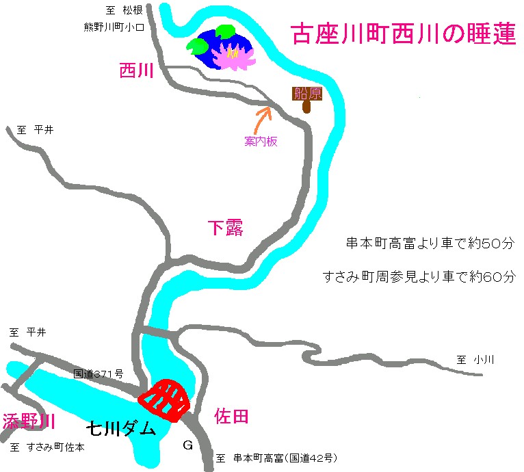 TVや新聞で取り上げられて、古座川の新名所になった、古座川町「西川の睡蓮」への地図です。