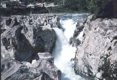 滝の拝は、川底が浸食で削られて、奇妙な形の岩になっています。